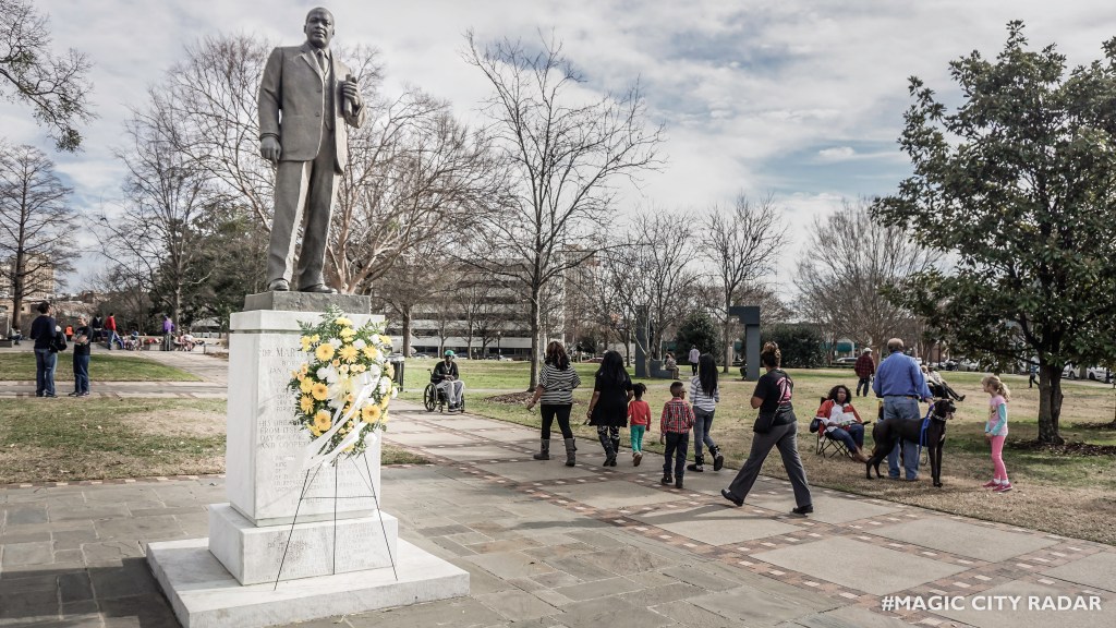 Kelly Ingram Park (historically known as West Park), was an assembly point for participants in the SCLC’s Project “C,” (for Confrontation)–sit-ins, boycotts, marches, and jailings designed to end segregation in Birmingham. Under the on site direction of SCLC President Martin Luther King, Jr., and local SCLC affiliate Fred Shuttlesworth, department stores were targeted for boycotts and protest marches organized. Dr. King was arrested and held in solitary confinement for three days, during which he wrote, smuggled out of jail, and had printed his “Letter from Birmingham Jail,” a profoundly moving justification for the moral necessity of non-violent resistance to unjust laws.